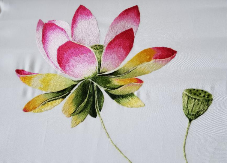 有人说:女人如花绽放,刺绣如诗美丽。一针一线穿梭的不只是布匹,织进的不仅是美丽的图案,更多的是人生的感悟。来自武汉市江岸区的汪琪今年40岁,是一位在家带孩子的全职妈妈。以前从来没有接触过汉绣的她,在武汉市残联微信公众号上得知汉绣免费培训的消息,就试着报了名。汪琪告诉记者,培训的几天时间,武汉迎来风雨降温天气,杜先娇老师无微不至的关怀和倾囊相授的热情,让学员们感到就像在一个大家庭,温暖而有力量。10天培训期间,汪琪用参针手法完成了一副海棠花的绣作,她告诉记者:“这片叶子刚开始的时候是自己绣的,特别生硬,经过杜老师的指导,我学会了颜色的过渡,深色和浅色要相互参和在一起就特别自然,这样绣出的叶子就灵动起来了,像真的一样。”