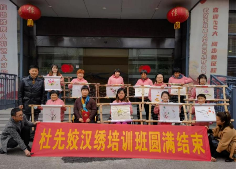 多年来,杜先姣接过老师黄春萍的接力棒,在武汉市残疾人艺术馆内的汉绣工坊,培养了一批又一批残疾学生从事汉绣事业。她不仅不收学费,还免费给学生们提供材料和所需的用品。在她的帮助下,部分优秀学生被各高校请去担任老师,还有的学生实现了自主创业。