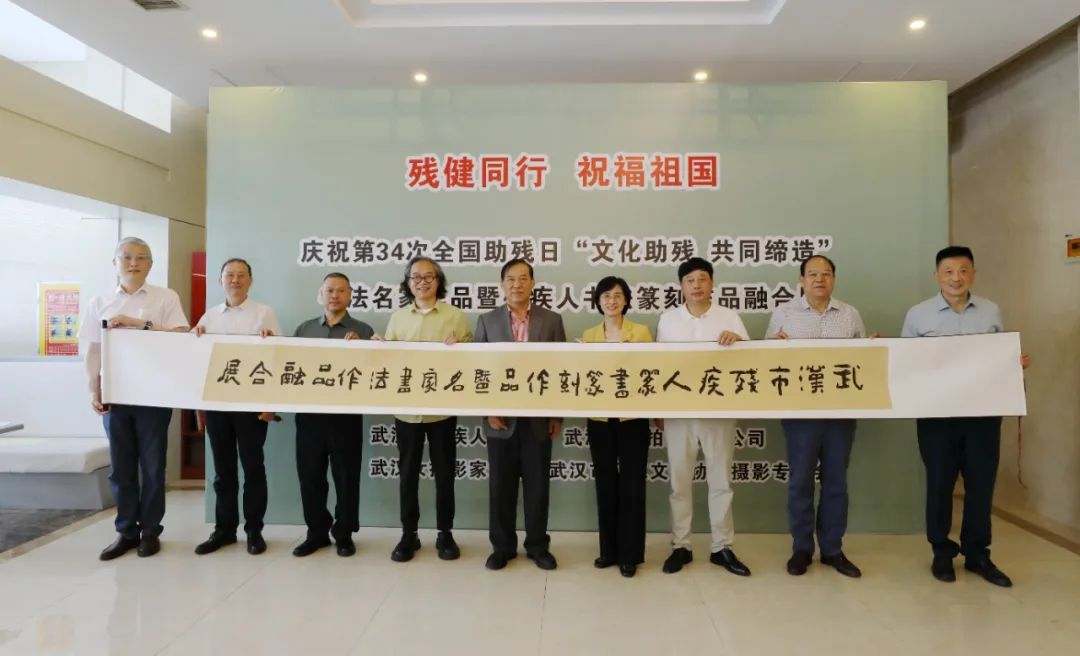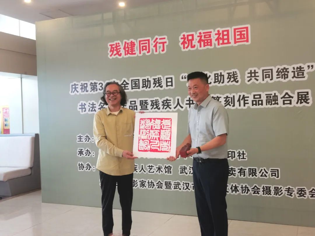 5月16日上午,由市残疾人联合会主办,市残疾人社会服务中心、东湖印社承办、市残疾人文联、武汉文物收藏家协会协办的“残健同行 祝福祖国”——第34次全国助残日“文化助残 共同缔造”书法名家作品暨残疾人书法作品融合展在武汉市残疾人艺术馆拉开帷幕。展览共展出近百幅作品,其中金伯兴、徐本一、刘永泽、孟庆星等专家名师作品近40幅以及25位特艺人才作品。展品包括篆书篆刻、特艺人才书法等,展示了我市残疾人篆书篆刻爱好者斗志昂扬、积极向上的创作状态,更凸显了平等、融合、共享的社会价值导向,彰显了文化牵手同行、共同缔造的深刻理念。省文联原党组书记、常务副主席刘永泽,省书法家协会副主席、市书协主席瞿忠谋,东湖印社执行社长张传斌,湖北画报社社长、湖北中小学教师书协会长陈明华,市残联党组书记、理事长李红敬,副理事长汪兴家等应邀出席。汪兴家主持开展仪式,市残联社服中心主任鲁力致辞。此次活动围绕丰富基层残疾人精神文化生活、增进残疾人福祉的目标要求,扶持发展特殊艺术、繁荣残疾人题材文艺创作,不断完善公共文化服务体系,为残疾人享有普惠多元的文化服务创造有利条件。东湖印社执行社长张传斌向市残疾人艺术馆赠送“武汉市残疾人艺术馆”篆书作品收藏印章。