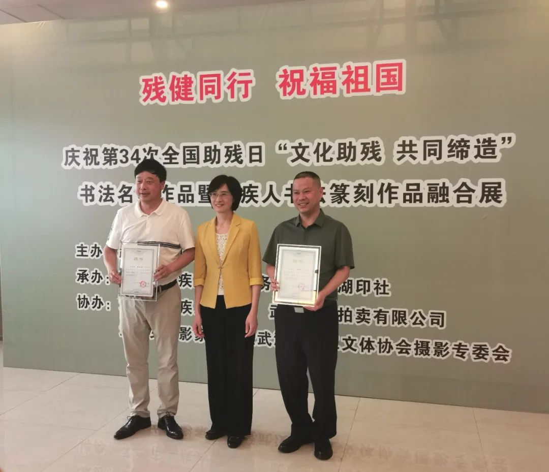 市残联党组书记、理事长李红敬向省书法家协会副主席、市书协主席瞿忠谋和湖北画报社社长、湖北中小学教师书协会长陈明华颁授“武汉市残疾人艺术馆书法篆刻导师”聘书。