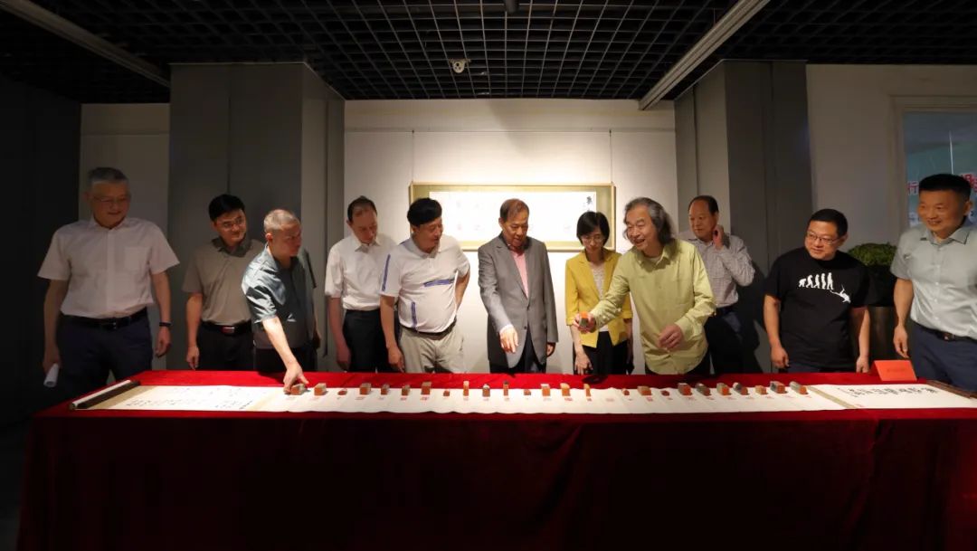 刘永泽、瞿忠谋、张传斌、陈明华、李红敬、汪兴家共同揭展“武汉市残疾人篆书篆刻作品暨书法名家作品融合展”书法长卷。